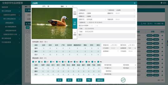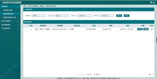 生物多样性监测管理系统具备植被监测管理、野生植物监测管理、野生动物监测管理、红外相机管理等功能。对各保护地生物资源按照植被类型、物种保护等级分类管理,对重要物种生长或栖息地(空间数据)进行样地设置管理,对生长态势等进行重点监测,不断发现重要物种新的个体并及时将其影像文字资料录入生物资源管理系统。通过监测数据的采集、分类、存储及管理,并提取其他模块中的相关数据,实现对群落结构、天然更新、物种多样性、生境状况、种群结构、种群动态、物候期、资源利用状态、外来入侵物种、人为干扰状况等监测指标的统计分析。