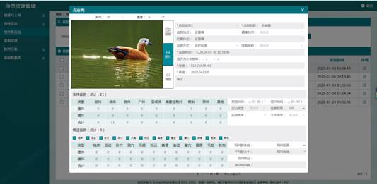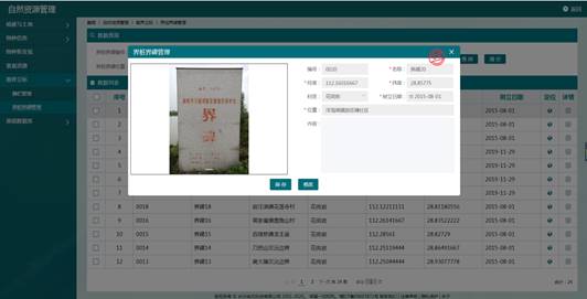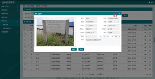 自然资源管理系统具备物种信息管理、植被和土地、物种新发现、景观资源、勘界立标5个功能模块。保护地将已经调查发现的物种进行数据提取、编目及数据信息完善,对自然保护区的每个物种资源进行编码、特征描述、图片等信息进行管理,可按照物种保护级别、物种属性进行分类和统计。将调查整理的植被覆盖及土地覆被类型进行数据处理,另外保护区的景观资源、标识牌和界牌界碑等数据进行登记并生成景观资源分布图和勘界立标分布图。
