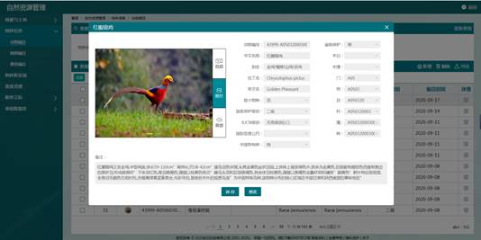 自然资源管理系统建立了物种、植被覆盖、土地覆被以及土地利用现状4个资源库。物种资源库,包含了包含23963种动物、35811种植物、2924种菌类物种属性、物种影音素材、保护级别、发现记录等信息;植被覆盖资源库,包含了11个植被型组、55个植被型和859个群系(含群系组、群系和4个亚群系)等信息;土地覆被资源库,包含了3个土地覆被组、21个土地覆被类组和46个土地覆被型等信息;土地利用现状资源库,包含了15个一级名称、62个二级名称等其他信息。